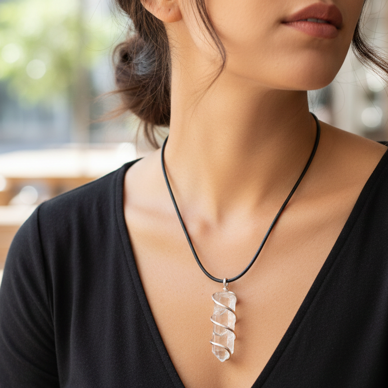 A nivel espiritual, el cuarzo actúa como un canal de conexión entre lo terrenal y lo divino. Eleva la vibración personal, fortalece la meditación y armoniza los chakras, especialmente el corona. Usarlo cerca del corazón o del cuello potencia su efecto protector y equilibrante durante todo el día.