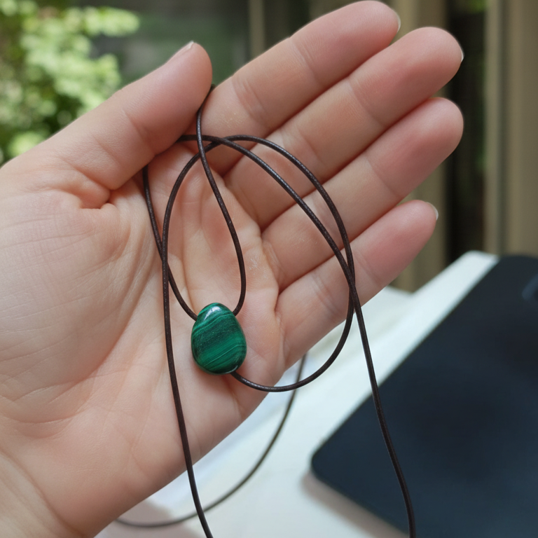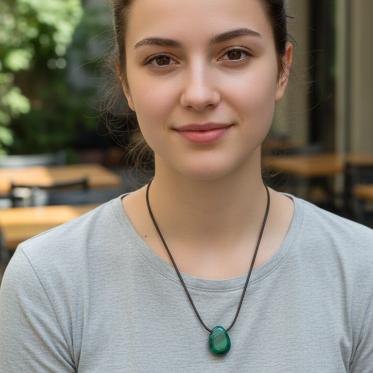 El collar de malaquita actúa como un poderoso protector energético, absorbiendo energías negativas y transformándolas en fuerza interior. Estimula la valentía, la transformación y la sanación emocional profunda. Su vibración intensa abre el corazón y favorece el cambio consciente.