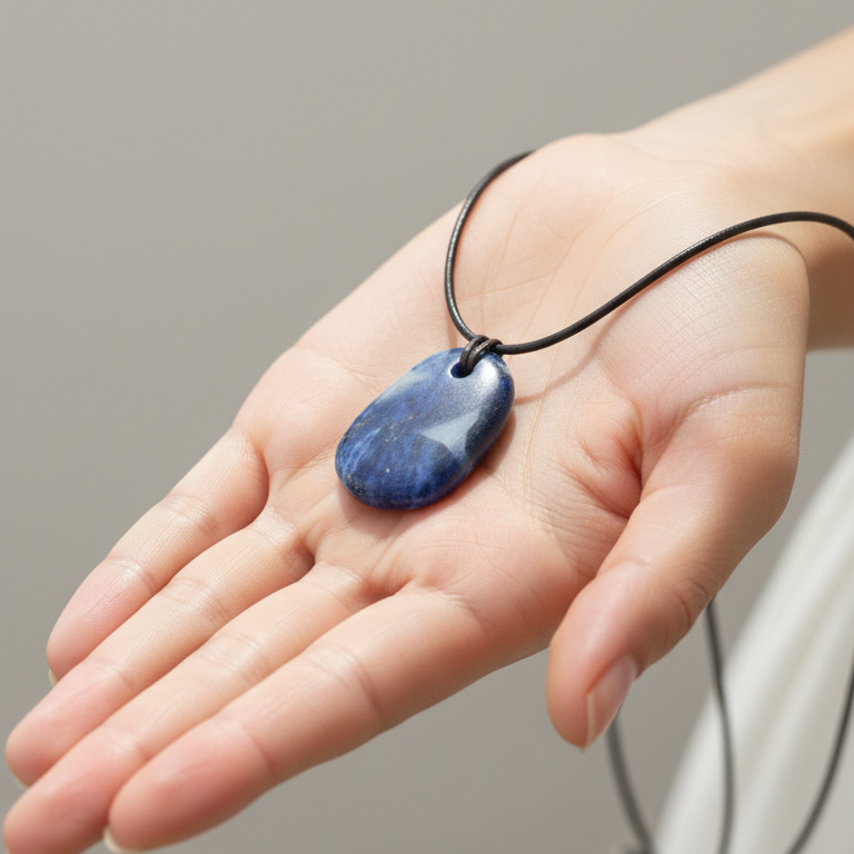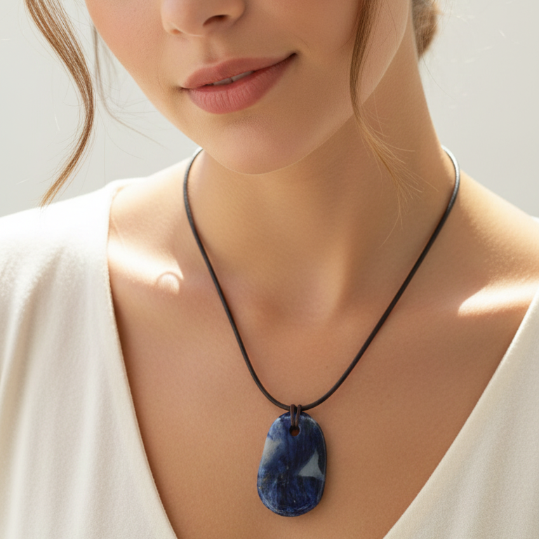 La sodalita es una piedra de color azul profundo con vetas blancas, conocida por su vibración calmante y su capacidad para potenciar la mente lógica y espiritual.
