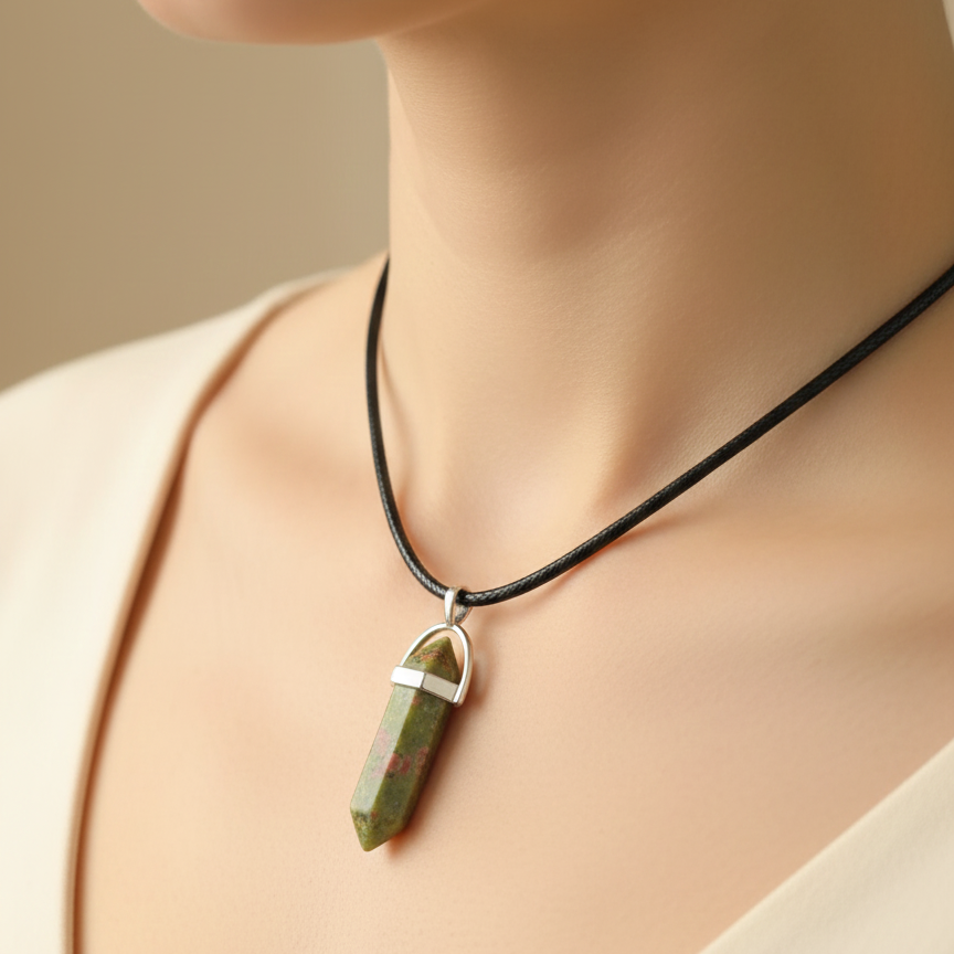 El collar de unakita equilibra emociones, fortalece la resiliencia y promueve la sanación del corazón. Ayuda a liberar bloqueos del pasado y fomenta el crecimiento personal desde el amor propio. Su energía armoniosa conecta cuerpo, mente y espíritu en perfecta sintonía.