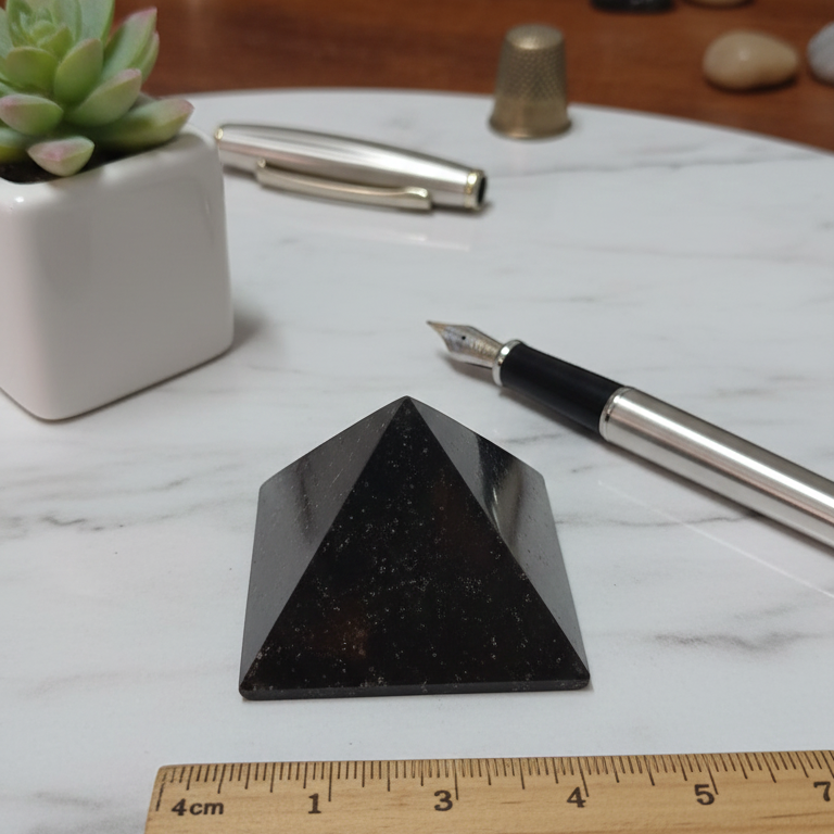La pirámide de shungit protege contra radiaciones electromagnéticas (EMF) y limpia la energía del entorno. Ayuda a reducir el estrés, promover la calma y fortalecer el campo energético personal. Es ideal para crear espacios equilibrados y proteger la salud energética en casa o en el trabajo.
