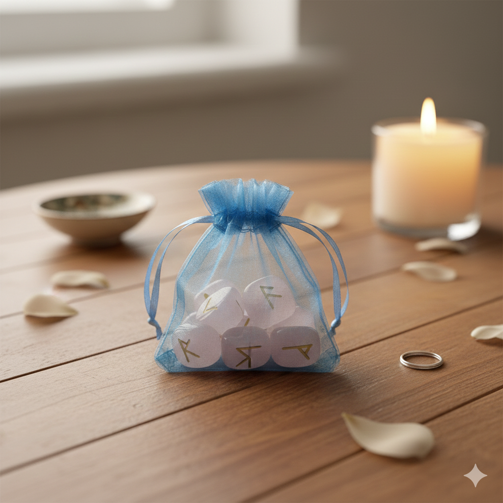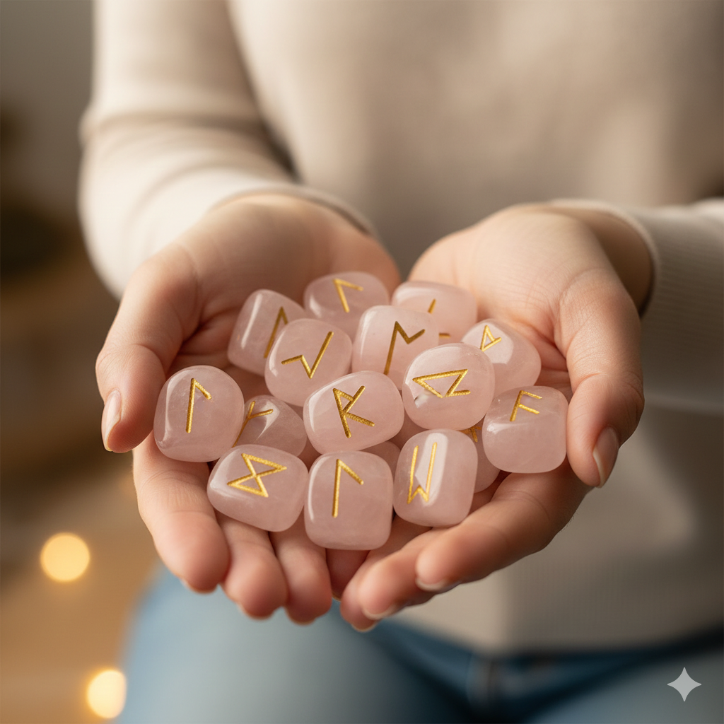 Juego Runas Cuarzo rosa artesanas en bolsita