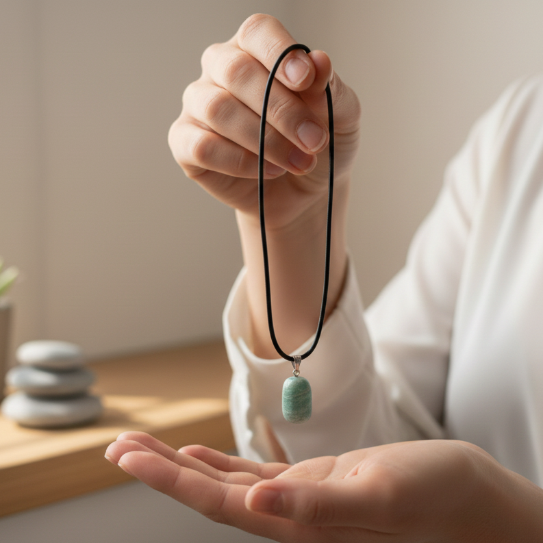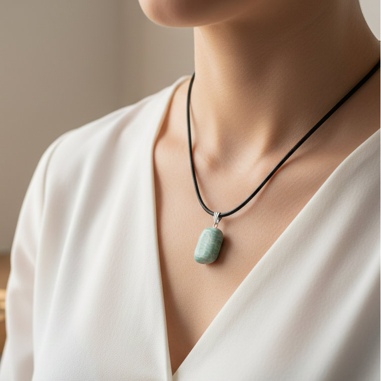 El collar de amazonita ayuda a calmar la mente, aliviar el estrés y fomentar la comunicación clara y sincera. Es ideal para personas que buscan equilibrio emocional, seguridad en sí mismas y fortalecer su expresión personal, especialmente quienes atraviesan cambios o momentos de ansiedad.