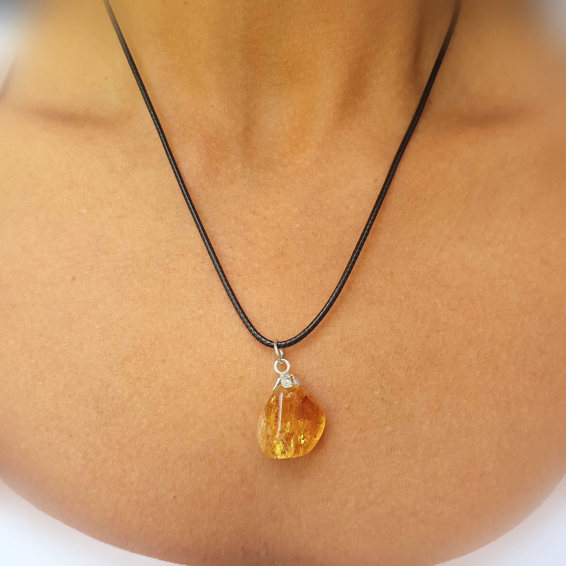 El citrino está asociado con el chakra del plexo solar, que regula la autoestima, la confianza y el poder personal. Además, la plata de ley potencia la conexión energética, aportando pureza y equilibrio al diseño del collar, convirtiéndolo en una pieza tanto hermosa como funcional.