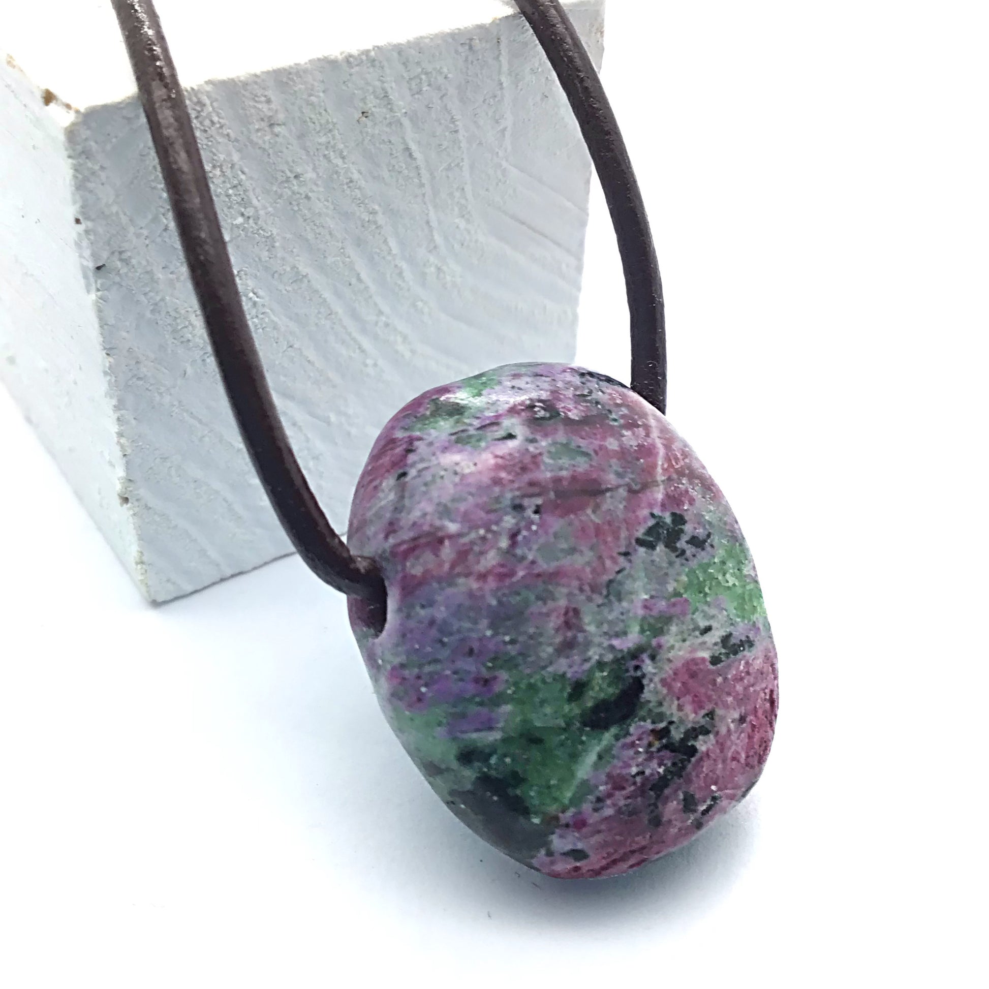 Con su forma de perita de 3 cm, este collar actúa como un punto focal de energía en el pecho, estimulando el chakra corazón y el chakra raíz. El rubí aporta vitalidad, coraje y amor propio, mientras que la zoisita ayuda a liberar bloqueos, aliviar el estrés y fomentar el crecimiento espiritual. Es ideal para quienes necesitan claridad emocional sin perder impulso.