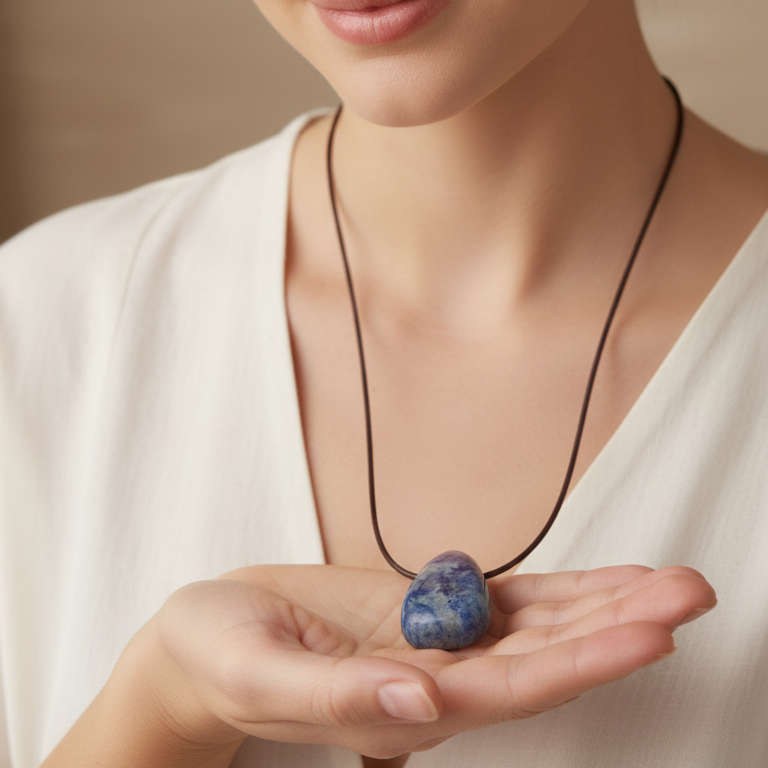La sodalita es una piedra de color azul profundo con vetas blancas, conocida por su vibración calmante y su capacidad para potenciar la mente lógica y espiritual.