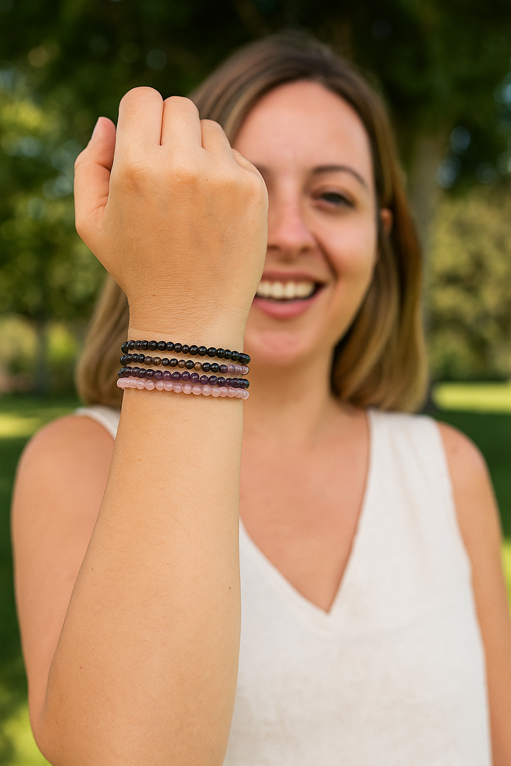 Desde ese día, cada vez que me coloco estas pulseras, no solo adorno mis muñecas: me recuerdo a mí misma que tengo el poder de volver al presente, de encontrar paz en medio del caos y de escuchar mi corazón. Son mucho más que piedras; son mis compañeras de calma, mis pequeñas guías para volver a casa: a mí.