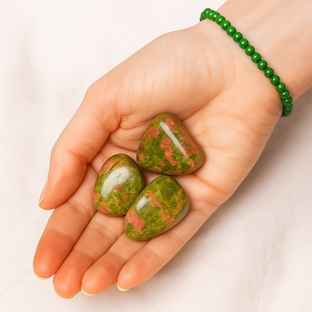 Al usar una pulsera o llevar un amuleto de unakita contigo —en el día a día, en momentos de introspección o durante procesos de transformación emocional— te abres a una energía que acoge, sostiene y alinea. Esta piedra fomenta la paciencia, la comprensión emocional y una estabilidad que te permite avanzar sin prisa, pero con firmeza. Te invita a escuchar tu corazón sin miedo, a reconectar con lo que sientes y a caminar con más armonía hacia nuevas etapas.