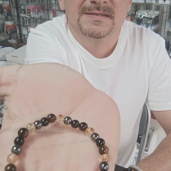 La pulsera de ojo de tigre, obsidiana negra y hematita combina protección, claridad mental y equilibrio energético. Fortalece la confianza, repele energías negativas y promueve la estabilidad emocional.