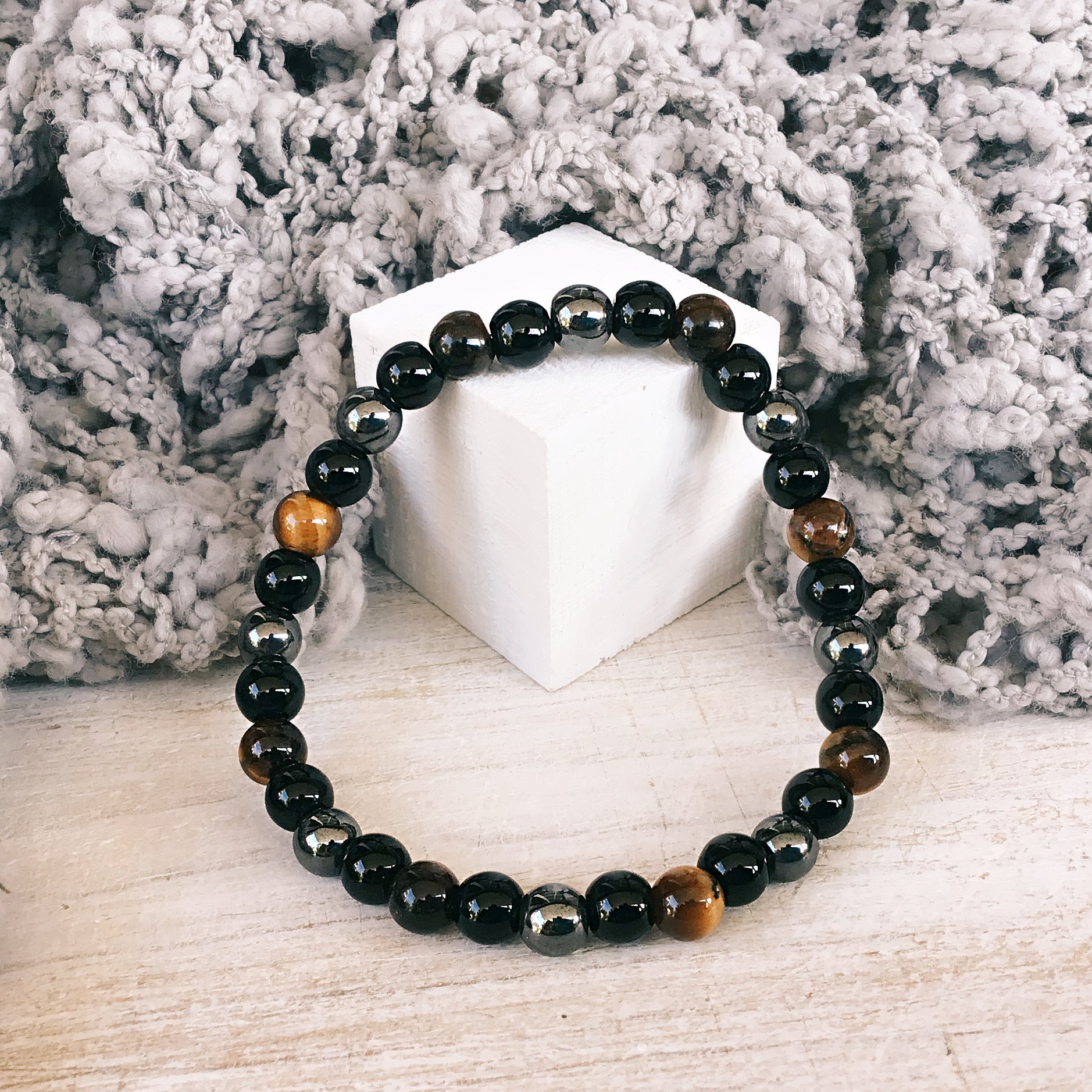 Despiertas, y el día parece llevarte por delante: pensamientos, pendientes, emociones ajenas que te rozan sin pedir permiso. Pero ahí, sobre tu mesa, está tu pulsera de Ojo de Tigre, Obsidiana Negra y Hematite. La tomas entre tus manos, sientes su peso, su energía viva… y algo dentro de ti cambia. 🌙